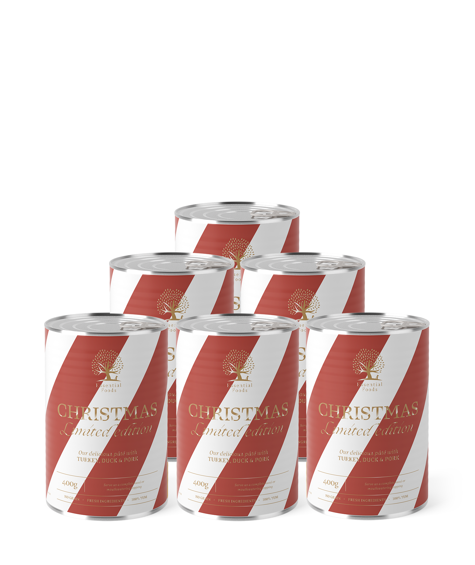 ESSENTIAL CHRISTMAS EDITION is our delicious Christmas pâté with juicy pieces of turkey, duck, and pork. Serve as a complete meal or as a topping for adult dogs. Grain-free and 100% yum!