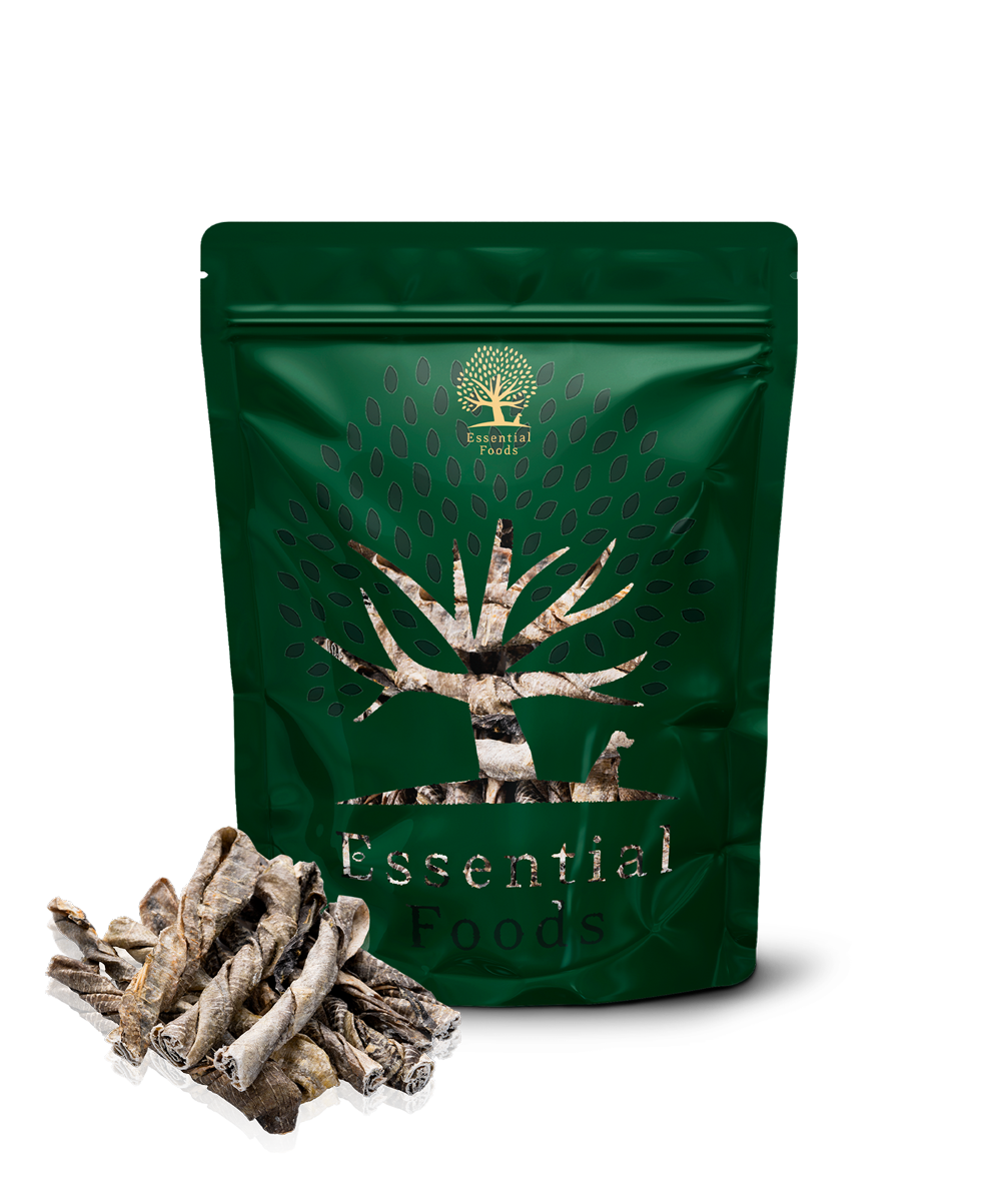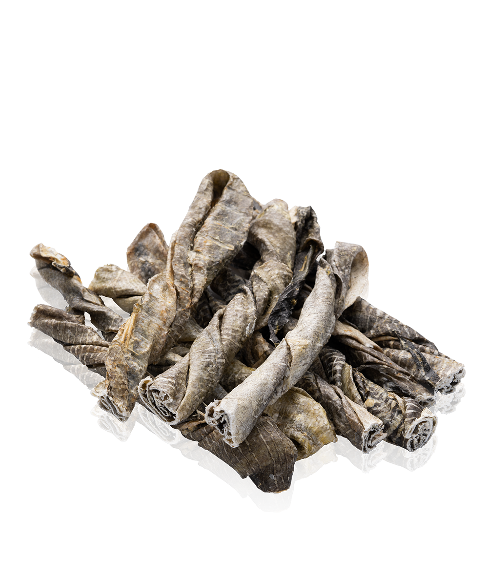 This is 100% cod, caught from carefully chosen fishing grounds. An all natural treat with no additives and no preservatives. The moisture in our NORTH SEA CHEWY DELIGHTS are gently extracted in our drying chambers, leaving you with a more nutritionally dense treat. Long chew time, rich in Omega 3 and an abrasive texture that helps with teeth cleaning, this is a must have for fish lovers!